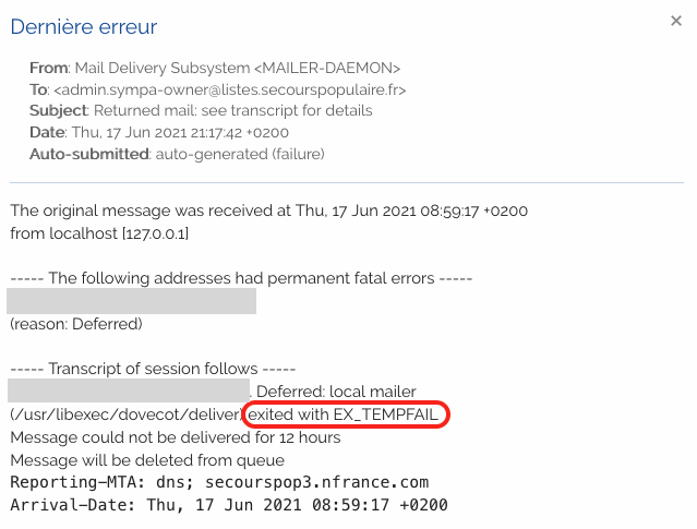 | Message | Notre serveur ayant reçu de NOMBREUX rapports de non-remise, les x abonnés listés ci-dessous ont été désabonnés de la liste xxx : adresse1@truc.com adresse2@bidule.fr Gestion des abonnés en erreur https://listes.secourspopulaire.fr/sympa/reviewbouncing/xxx |