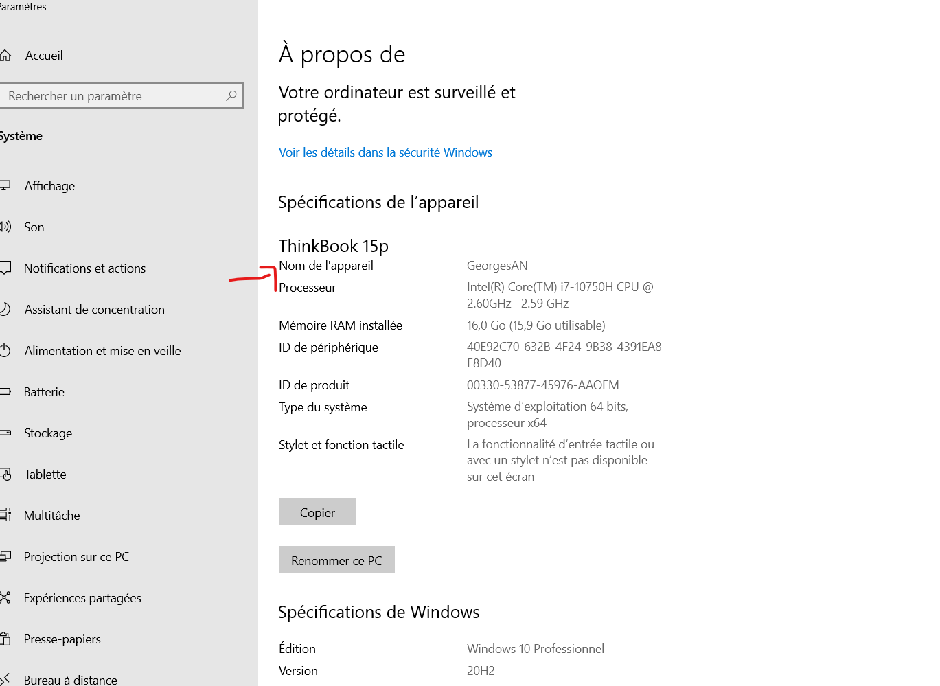 La page à propos de s'affiche et vous y trouvez le nom de votre ordinateur (sur l'exemple, le nom de mon ordinateur est GeorgesAN ; le vôtre sera différent).