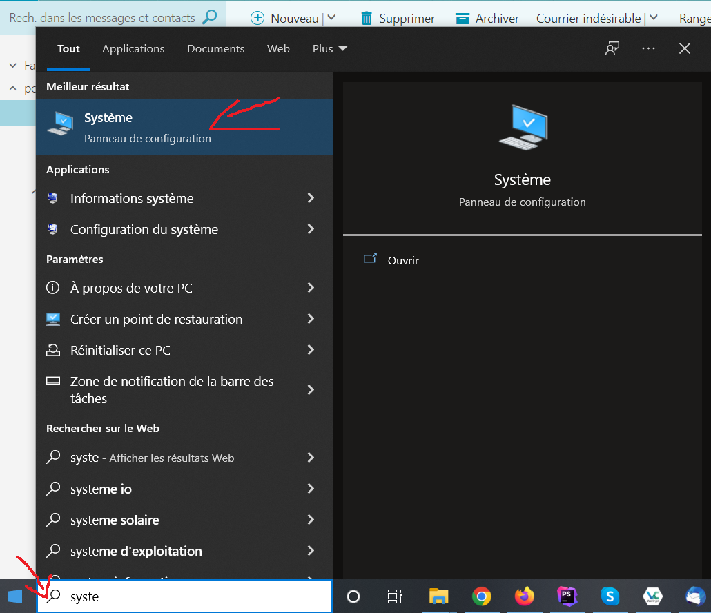 Tout d'abord, il vous faut ouvrir le menu de Windows en bas à gauche puis taper système au clavier. Cela devrait afficher comme résultat le panneau de configuration dédié au système. Cliquez dessus.