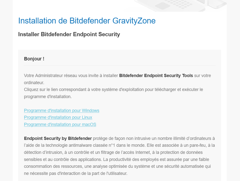 Chaque utilisateur·ice reçoit, une fois sa licence enregistrée, un email envoyé par Bitdefender :