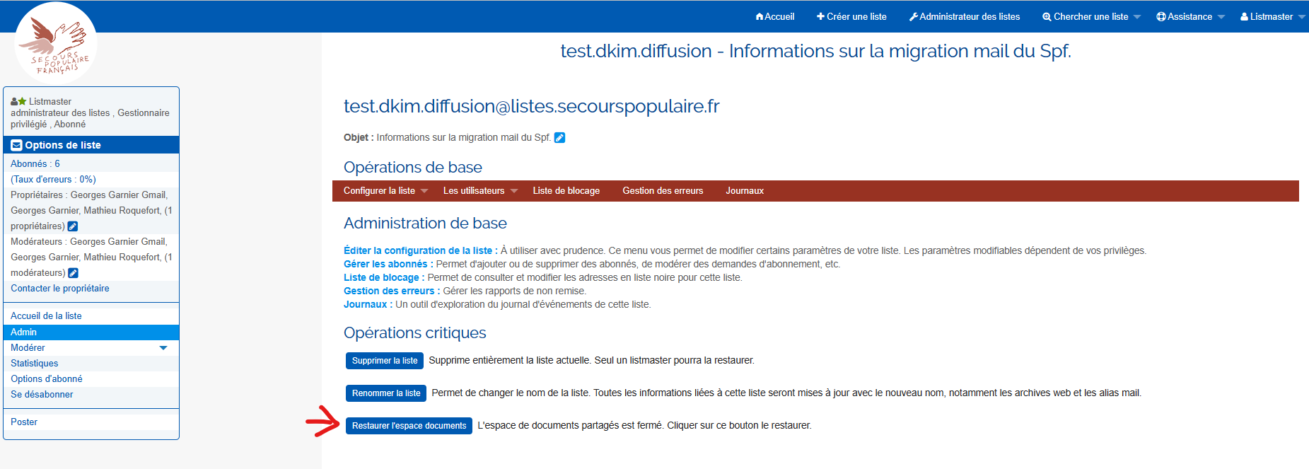 Sur l'interface d'administration de votre liste, cliquer sur Configurer la liste puis sur Restaurer l'espace documents