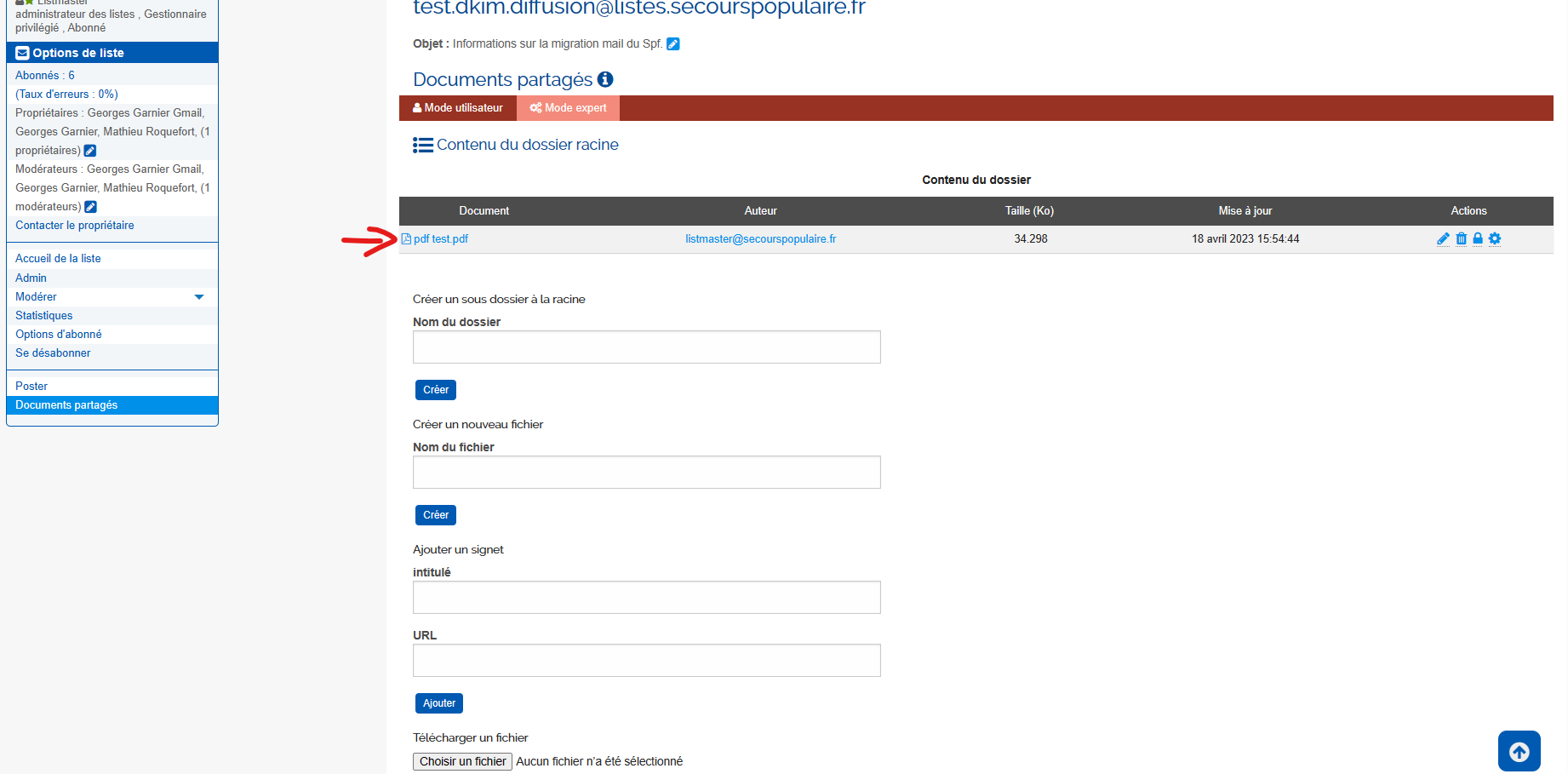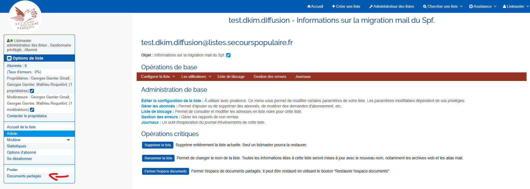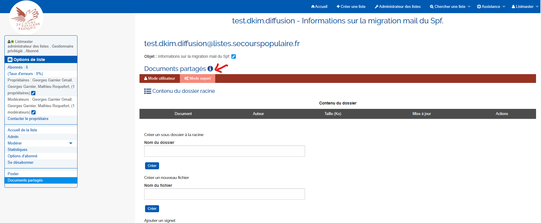Sympa mets à disposition des listes de diffusion un espace de documents partagés. Cette option n'est visible qu'aux propriétaires des listes de diffusion et permet d'ajouter des fichiers qui dépassent le quota autorisé lors d'un envoi classique. Si vous êtes propriétaire de listes et souhaitez utiliser les documents partagés, suivez les indications ci-dessous.