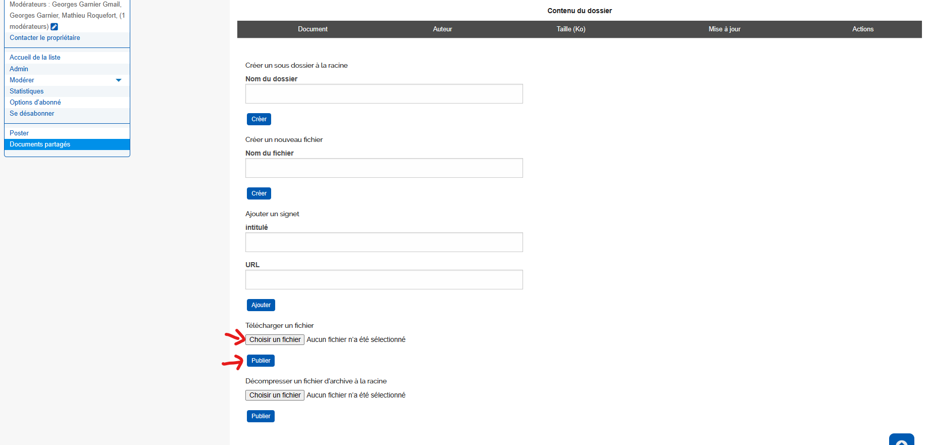 Sur cette interface il vous est possible de créer des dossiers, fichiers et signets mais également d'en charger. Pour ce faire, cliquer sur choisir un fichier, puis une fois le fichier sélectionner cliquer sur publier.