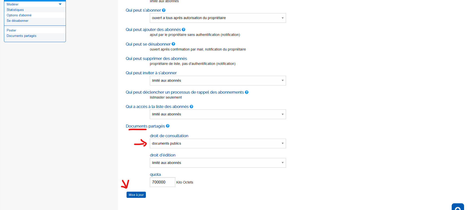 Pour finir, plus bas sur la page des droits dans la partie Documents partagés, il vous faudra sélectionner document publics dans droit de consultation et valider en cliquant sur mise à jour.