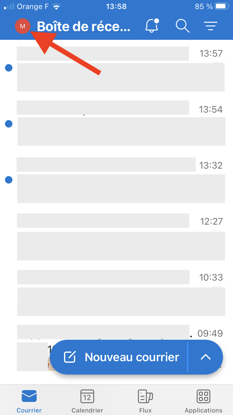 Ensuite, ouvrez Outlook, et cliquez sur l'icône avec votre initiale, en haut à gauche :