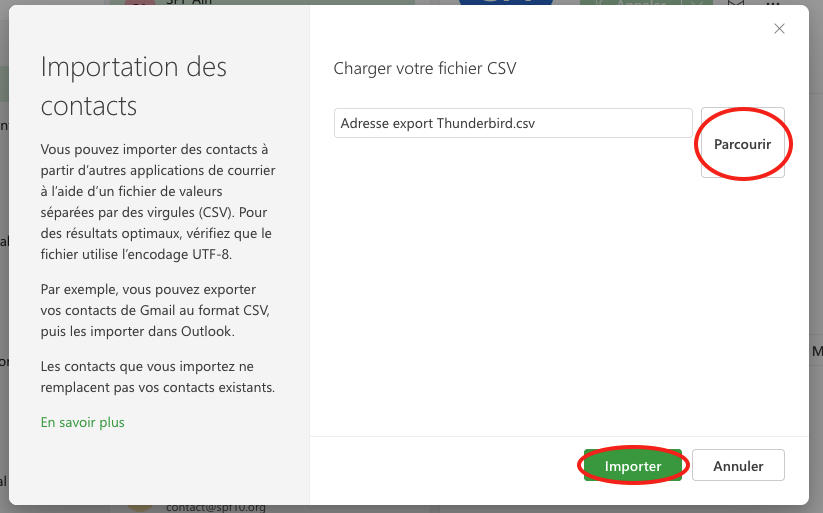 Dans la fenêtre qui s'ouvre, cliquez sur Parcourir, puis choissez le fichier csv qui contient vos contacts. Puis cliquez sur Importer.
