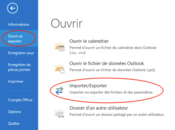 Dans Outlook, sélectionnez Fichier puis Ouvrir & Exporter et enfin Importer/Exporter