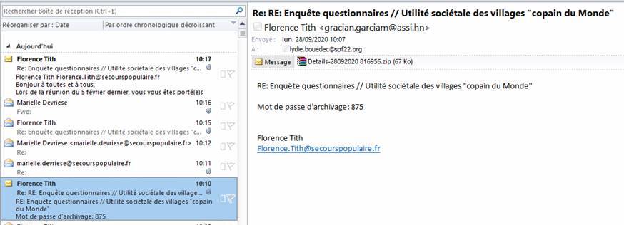 Le propre d’Emotet est d’inonder les utilisateurs de messages qui semblent légitimes, dans le but que vous ouvriez une pièce jointe. Toutes les personnes qui ont, un jour, échangé un message avec une adresse du Secours populaire qui a été piratée sont donc susceptibles de recevoir un message frauduleux.