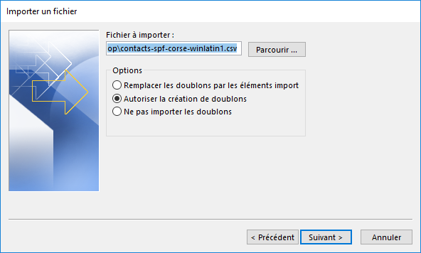 Si vous avez déjà re-créé manuellement certains de vos contacts dans Outlook et que vous ne voulez pas créer de doublons, sélectionnez l’option Remplacer les doublons par les éléments importés.