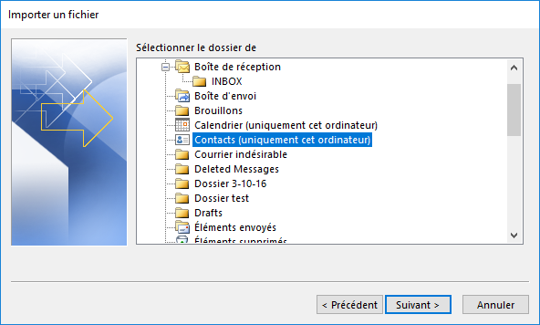 Dans la zone Sélectionner le dossier de destination, sélectionnez Contacts. Puis Suivant.