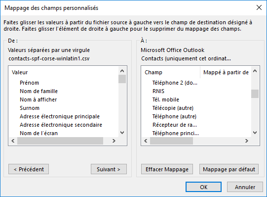 Une fenêtre s’ouvre, elle est difficile à utiliser car trop petite. A gauche, vous avez les intitulés des colonnes dans le fichier que vous importez. A droite, vous avez les champs disponibles dans Outlook. Il vous faut glisser les intitulés à gauche vers leur correspondance à droite.