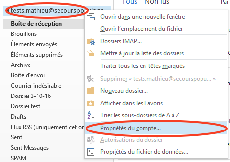 Dans Outlook, faites un clic droit sur votre boîte mail, au-dessus de la Boîte de réception, puis choisissez Propriétés du compte… :