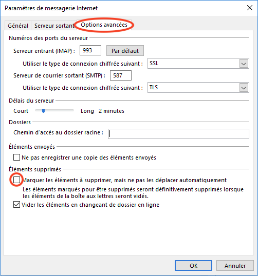 Une nouvelle fenêtre s’ouvre. Allez sur l’onglet Options avancées et dé-cochez la case Marquer les éléments à supprimer… en bas :