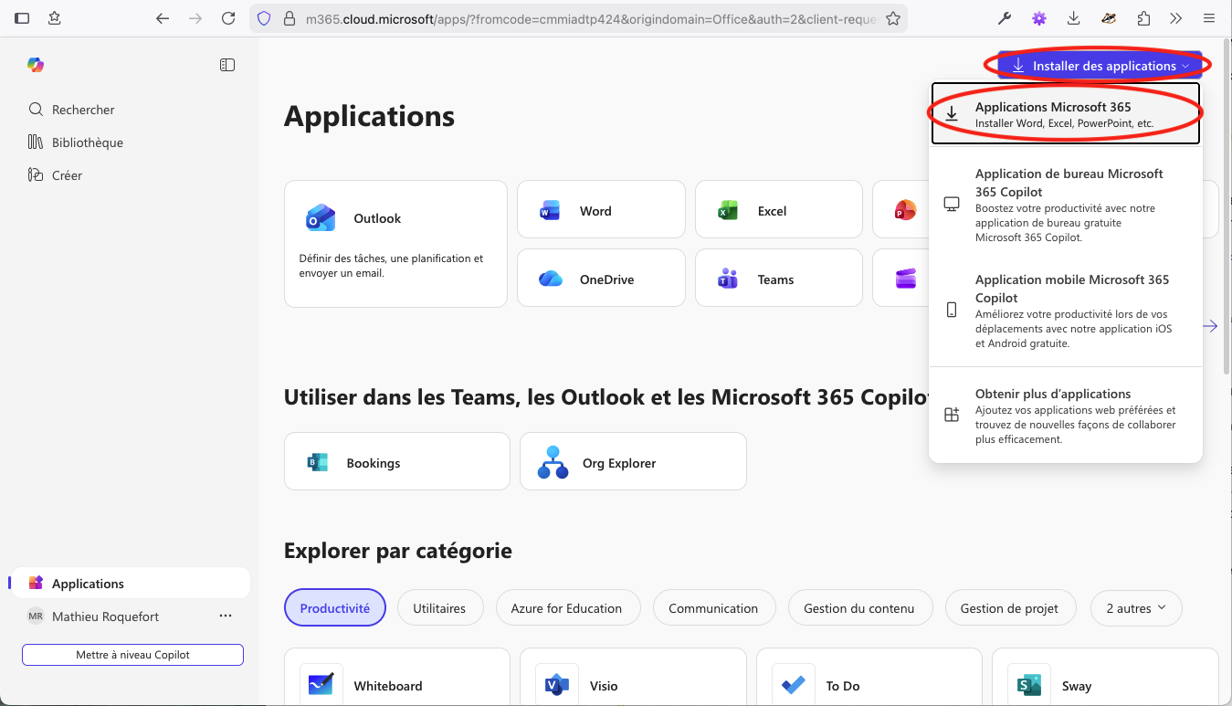 Dans la fenêtre qui s'affiche, en haut à droite, cliquez sur Installer des applications, puis Applications Microsoft 365.