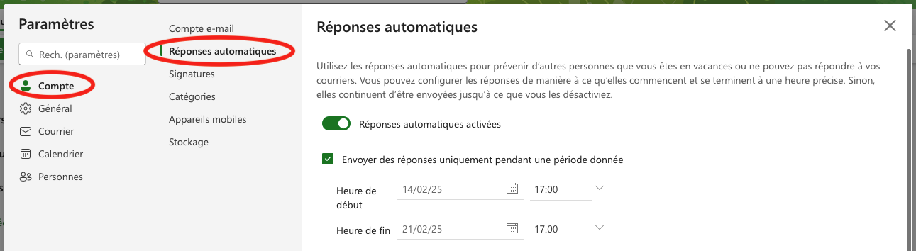 Compte, puisRéponses automatiques - Activez les réponses automatiques, et paramétrez votre répondeur. Il est conseillé de l'activer dès votre départ mais, si vous revenez un lundi matin, de le désactiver dès le vendredi soir précédent.