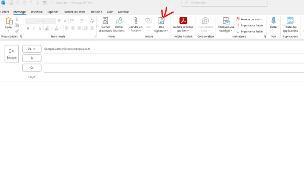 Nota : Selon la taille de votre fenêtre, l'option peut être cachée dans le bandeau. Si vous ne la voyez pas directement, elle se trouve sous l'onglet joindre (pour joindre une signature)