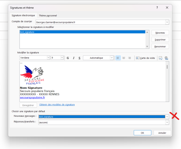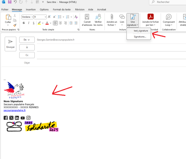 - Il est également déconseillé de modifier votre signature dans les paramètres d'Outlook, car un script la régénère chaque nuit. Toute modification manuelle sera donc effacée le lendemain.