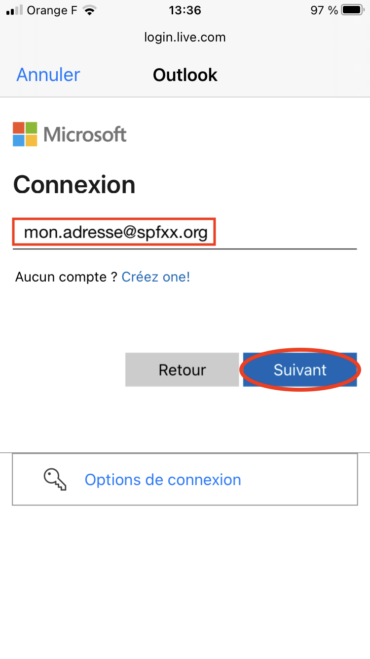 Indiquez ensuite votre adresse email @spfxx.org et cliquez sur continuer.