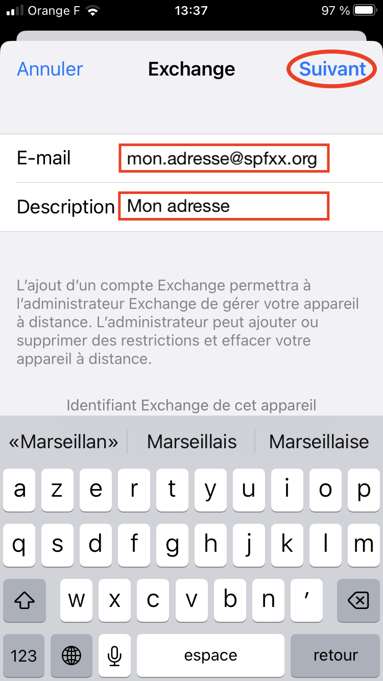 Complétez avec une Description (pour vous permettre de différencire les comptes configurés sur votre téléphone, personne d'autre que vous ne la verra), et Suivant à nouveau :
