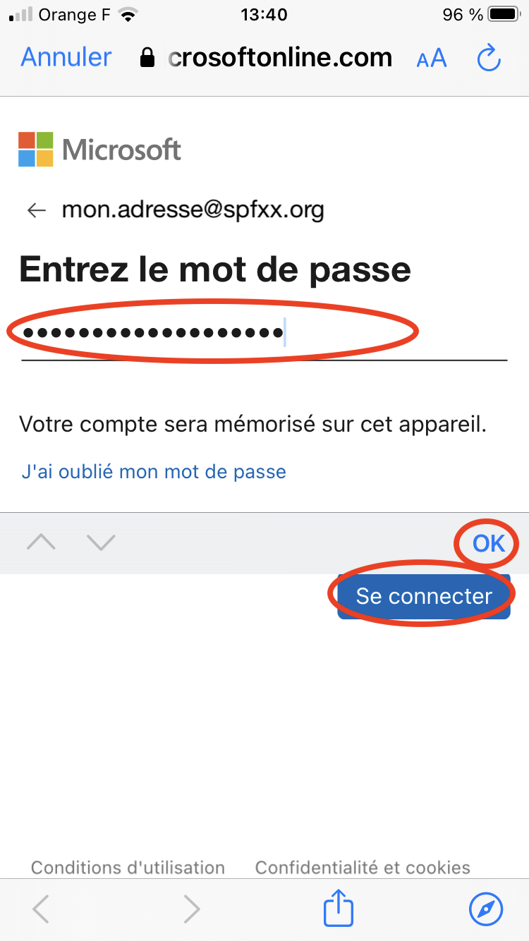 Renseignez le mot de passe de votre boîte mail, puis OK, puis Se connecter :