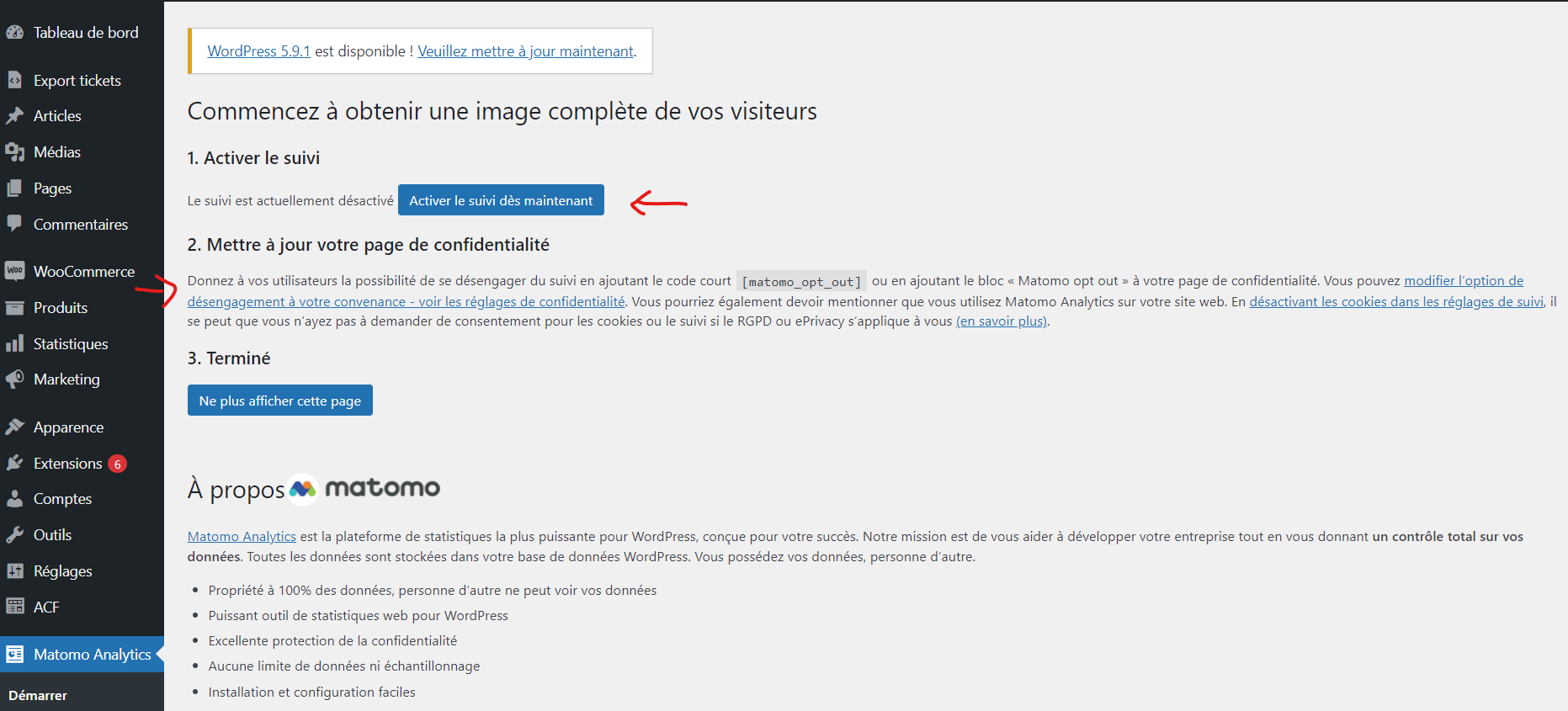 Il ne vous reste plus qu’à activer le suivi dans le panneau d’administration de Matomo au sein de votre backoffice Wordpress et à suivre les recommandations proposées.