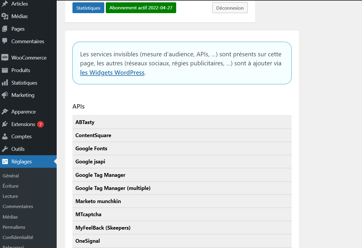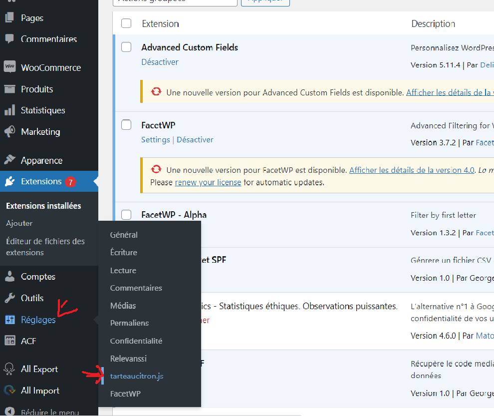 Une fois fait, rendez-vous dans l’onglet Réglages du back office et selectionnez tarteaucitron.js