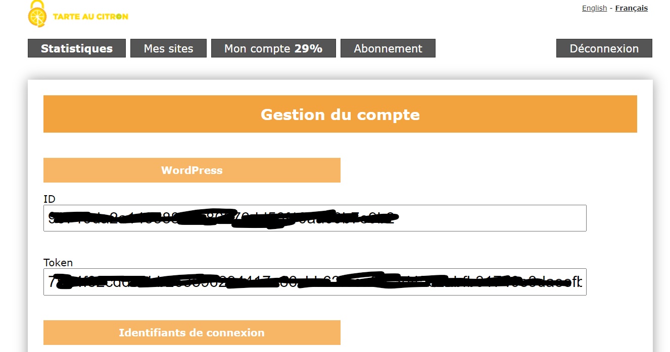 Vous arriverez sur la page de configuration et il vous sera demandez d’ajouter votre ID ainsi que votre Token. Vous obtiendrez ces informations dans l’onglet mon compte sur le site de Tarteaucitron après y avoir créé un compte : https://tarteaucitron.io/fr/pro/
