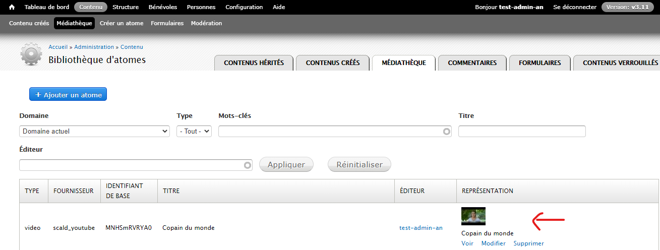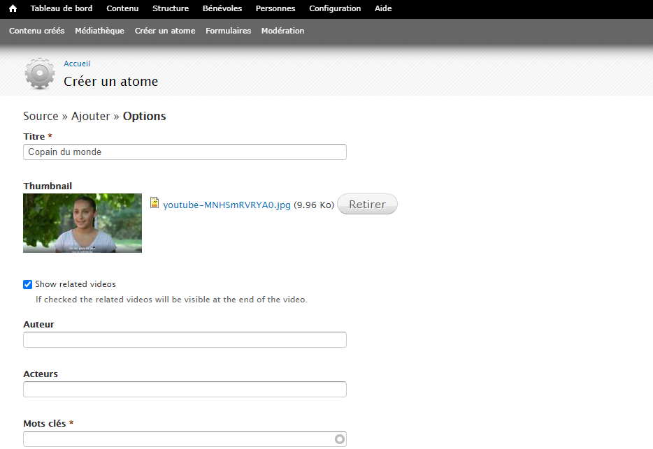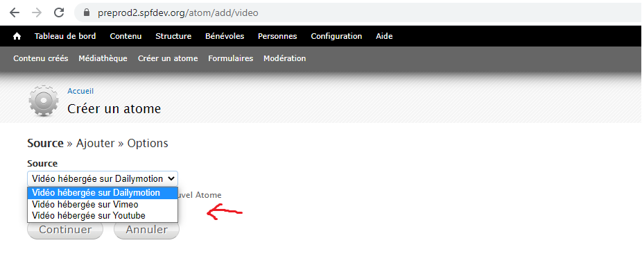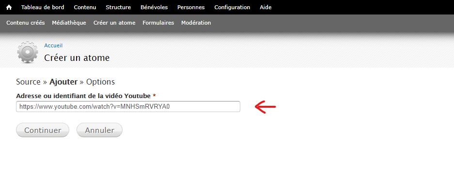 Sur le site de l’Union, allez dans l’onglet Contenu puis Médiathèque. Là, ajoutez un atome de type Vidéo. Choisissez sa Source dans la fenêtre suivante. Cliquez ensuite sur Continuer.